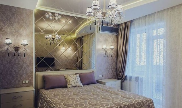 A mirror is more than a decorative meaning above the bed, as it is inconvenient to look into it. The place over the headline is often used by designers to give the room a depth and correction of proportions. Mirror panels, compositions or models in original frames are more often hung over the bed.