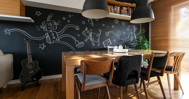 The desire to arrange your interior in an original way leads to the fact that the most unexpected ways of implementing the plan appear. Recently, a slate board is often used, which helps to solve several problems: decorate the situation, create a place for recordings and drawings.