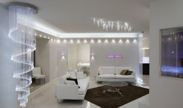 Chandelier or lamps belong to basic lighting, local and directed type. The chandeliers are ceiling and suspended, the latter are adjustable in height. Classic chandeliers multi -stage or with several horns with plafones, modern ceiling chandeliers are structures made of LED ribbons or halogen lamps controlled from the remote control. The material of the decor of chandeliers and lamps is diverse from crystal to plastic and depends on the style of the interior.