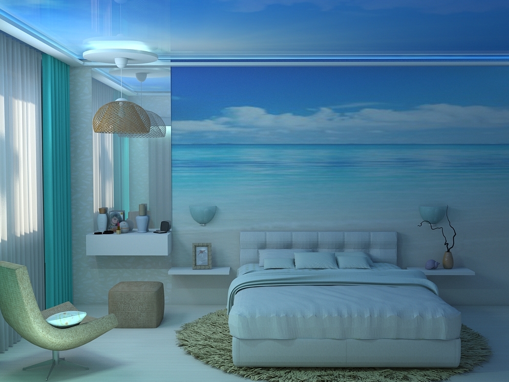- Blue ceiling in the bedroom. We have mentioned more than once the soothing effect of this beautiful heavenly color, so if you have a problem in order to quickly relax and return to normal after a busy day, then it is difficult to come up with the best choice for decoration of the room. Various new items in the form of beautiful photo printing or cunning electronic devices help to create the right mood. For relaxation, you can use blue ceiling backlight in the bedroom, fiber fiber or other tiny spotlights imitating stars.