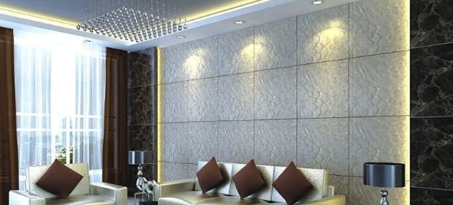 - 3D panels. 3D panels for interior decoration have a voluminous effect. They have a wide variety of textures, patterns and shades. Relief panels are made of different materials, their cost depends on this. Volumetric design is used for decoration of walls, ceiling, niches, contrasting the necessary areas in the interior.