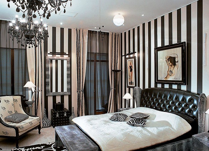 Another way to use black and white wallpapers in the room is to choose a lighter-shaped wallpaper for them. In this case, one wall or half of all the walls in the room, pasted with wallpaper with a predominance of black, will be balanced by other, lighter parts of the finish, which will negate the crushing and negative effect.