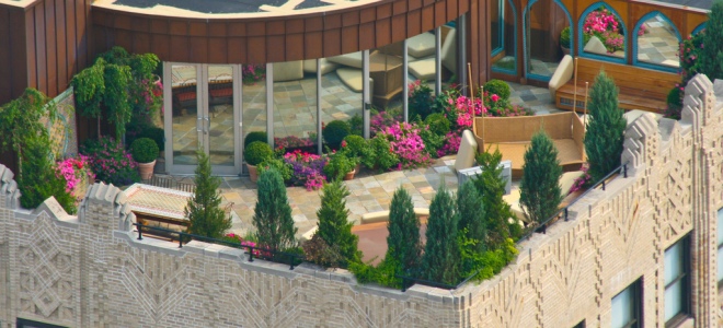 Landscaping can be intense, large plants, trees, shrubs are used for the roof garden, lawns are laid. Terras suggest the installation of small architecture elements – grilles, arbors, decorative walls. The installation of sofas, soft corners, tables, garden furniture is appropriate. Some designers have entire garden complexes with flower beds, waterfalls and fountains on the roofs.