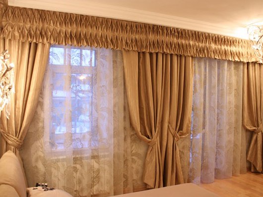 In a spacious large room, you should use lush lambrequins, they will help to create a missing comfort here. Many are interested in how to properly lay the folds on the lambrequin. The simplest are one -sided folds. They need to be laid in one direction. Oncoming folds are collected so that they are laid towards one to the other. It is not a difficult thing to create dollar folds. Our bows are nothing but the opposite side of the previous counterclaims.