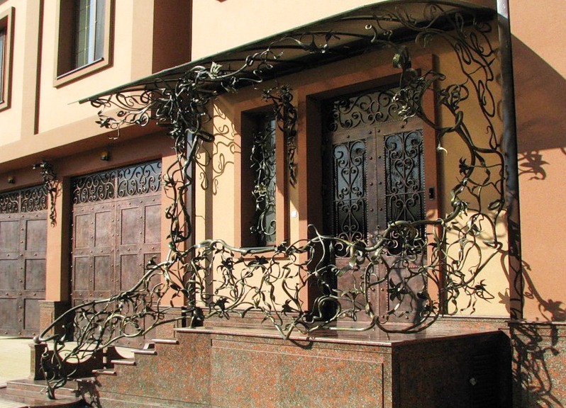 Forged porch canopies are much more practical and durable than made of wood, plastic or any other material, they are strong, not subject to corrosion, since modern anti-corrosion compounds are used to cover them, while they fit perfectly into any architectural style.