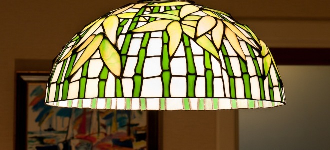 Tiffany ceiling stained -glass chandeliers give the interior greater expressiveness. The refracted light, falling apart into many rainbow glare, avoids everyday life in the interior, improves mood and decorates the room.