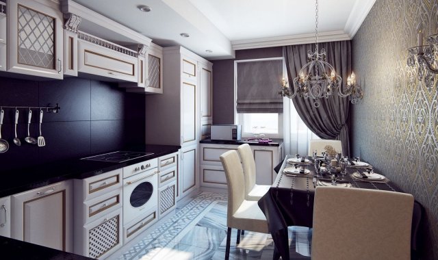 The distribution of furniture in the room depends on the area, height of the ceilings and the shape of the kitchen.