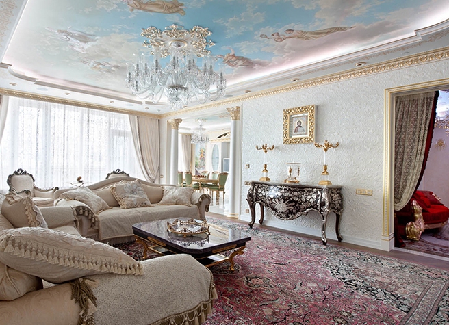 Elite modern ceilings are decorated not by one -color films, but by luxurious images, combined with the second level, such designs look like paintings in a frame. Coatings with images or stucco molding in the Empire, Baroque, classic style look luxurious. Recently, you can find ceilings from elite ceiling panels made of wood, stone, they create an atmosphere of wealth and luxury.