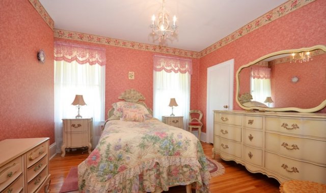 These shades will make the bedroom interior more elegant and feminine, regardless of the chosen style. Pink is perfect for walls and textiles. Green can be used as an accent color. You can choose lamps, a puff, bedside tables or a blanket of this color.