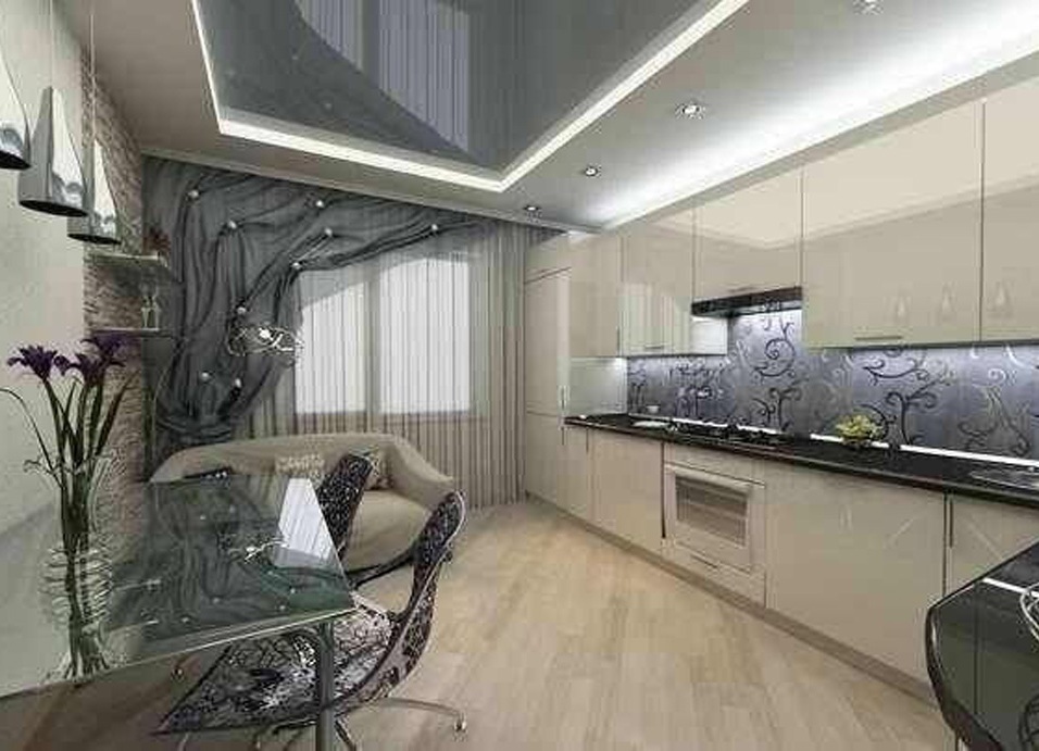 A properly designed combined stretch ceiling in the kitchen, combining various textures and shapes, can visually expand the space, making a small room of the kitchen unique.