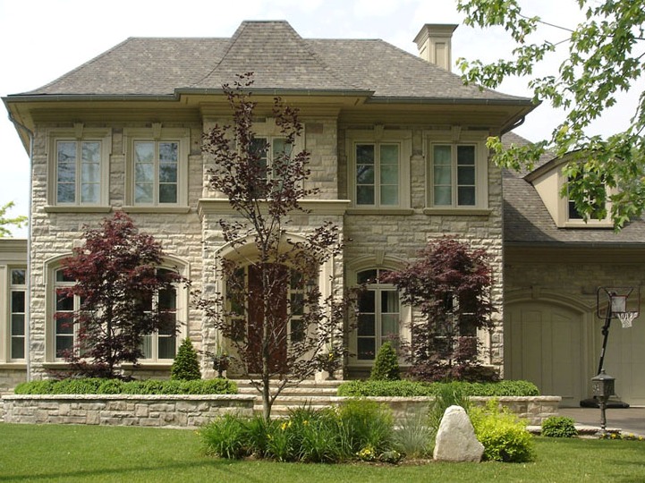 3. Faced facade stone. Most often, sandstone, quartzito-sand, limestone, travertine, granite are used for work, although other options are possible. In addition to piece stones, facing cladding of natural stones of various shapes, which are attached on anchors, which greatly facilitates the work of builders and accelerates the process, are suitable for this purpose. Choosing a natural stone for cladding external walls, you instantly highlight your mansion among all neighboring buildings. This will immediately increase the prestige of the owner, will talk about his status and good taste.