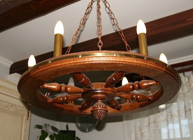 Natural wood in design is primarily associated with antiquity. That is why lamps from such material often have an antique appearance. Wooden chandeliers made under the old daysthey can have the shape of a rough deck, snags hanging on chains, a massive cross from trunks with forging elements, are supplemented with numerous lights with light bulbs. Wooden chandeliers in the form of a cart wheel are popular. It is suspended to the ceiling with ropes or chains, light bulbs are mounted on top.