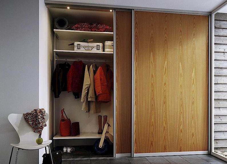Squares made of drywall are: built -in, corner and straight, with ordinary or sliding doors. The most practical option for small-sized premises is a built-in wardrobe made of drywall. Usually it is built into the existing niche or between the two walls of the room. A built -in sliding cabinet made of drywall to the ceiling and walls of the room is attached, so you can not make the rear wall in the closet. The internal filling of the wardrobe, the shelves, hangers, boxes are completely designed by you personally at the stage of developing the drawing.