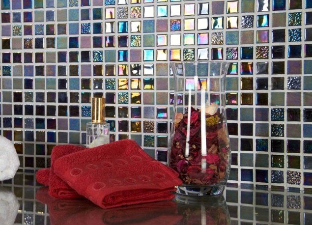 Mosaic glass tiles, due to its properties, are successfully used for wall decoration in the bathroom. Using a glass mosaic for finishing, it can be successfully combined: plain – with colored stretch marks and mixes, creating various compositions. The materials from which the glass mosaic is created have a reduced, moisture -absorbing coefficient, so it is rational to use such tiles in rooms with high humidity.