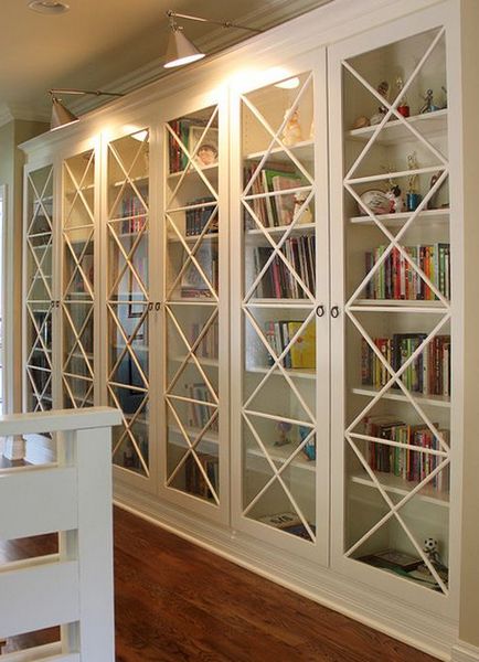 If we are talking about the library, the most appropriate will be a bookcase with glass doors from an array of expensive wood. Such solid furniture will emphasize the status and high position of the owner.