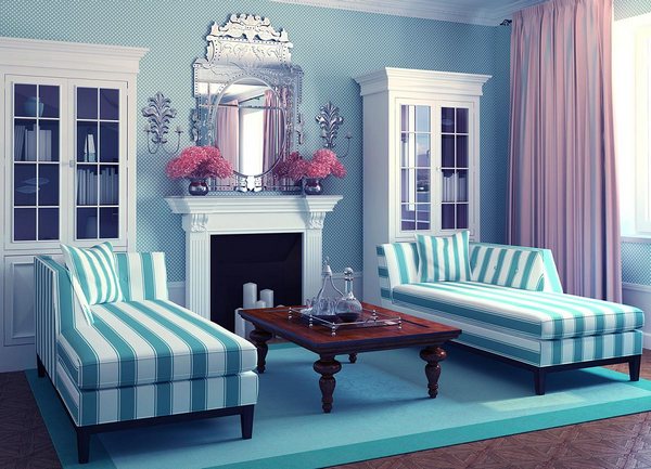 Turquoise color in the interior of the living room will become dominant. You are unlikely to be able to drown it out to some other, and you are unlikely to want this. Tiffany’s color wallpaper is perfectly combined with orange – this is a certain oriental classic that looks modern, fresh, bright. Do not be afraid of other bright combinations.
