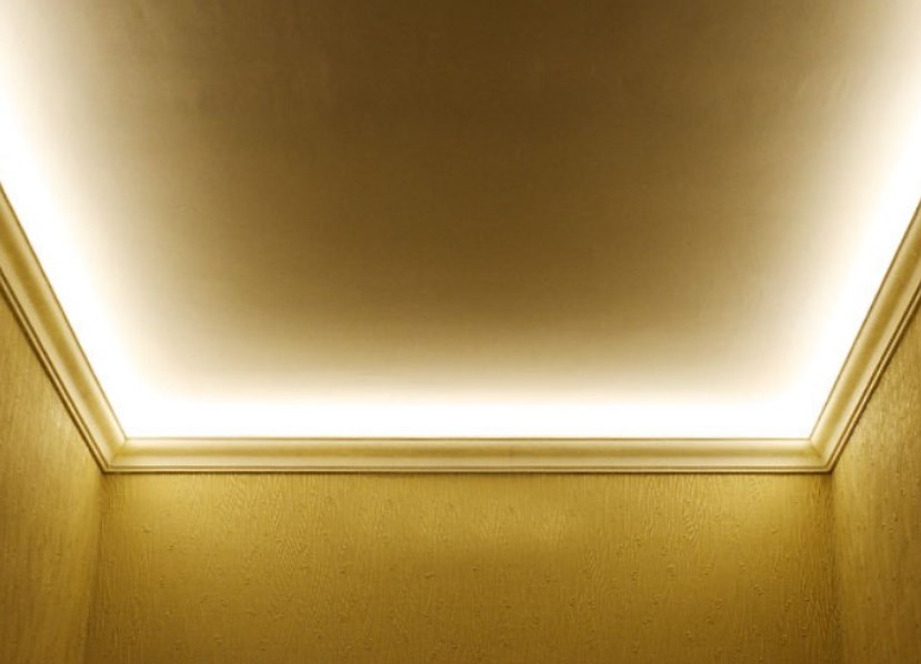 Since the LED strip practically does not dissipate heat and favorably emphasizes the ceiling finish, a polyurethane cornice for LED strips can be safely used to illuminate a stretch ceiling.