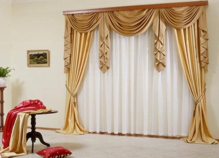One of the most traditional ways to decorate curtains is to use lambrequins. These are additional sheets of fabric that are thrown horizontally over the cornice and form beautiful draperies. Best suited for decorating curtains for the living room or bedroom.