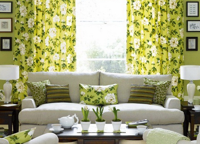 A living room with green curtains will also look organic. You just need to choose a version of this decoration for the window that will match the rest of the decor. Warm-colored walls require warm shades of green, and cold-colored walls require cold shades.
