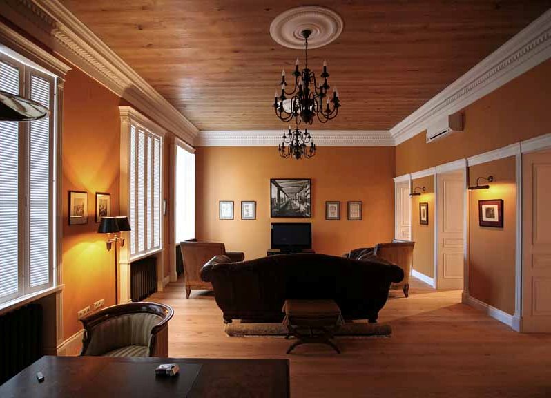 Of course, the lining ceiling looks best in natural, rustic styles: noble estate, Russian hut, chalet, Provence. At the same time, lining can be laid out on the ceiling in various ways, creating unusual geometric compositions from squares, rhombuses, and polygons. The lining can fit into the colonial style if you create longitudinal guides, painted with dark paint and creating the effect of beams, and lay transverse planks between them. The lining will look good in classical, empire and art deco styles. Repair experts know how to create the most extraordinary ceiling structures from this material. Perhaps, only in modern trends of minimalism and high-tech will clapboard ceilings be inappropriate, but even here they can be played up in an interesting way and still fit into the decor.