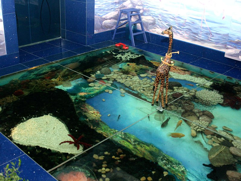 - Glass floor windows. Floors of this type can be filled with various decorative elements, most often with a marine theme. To create a window, they practice making a niche, or raising the surface to the required height. Special frames are made for this type of flooring. Glass floors with display cases can be found in both the bathroom and living room.
