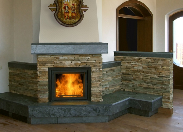 - Cladding the fireplace with natural stone enjoys enormous popularity. This material looks very respectable, and also fills the house with its lively energy and contributes to the positive emotions received from sitting by the fireplace with family and friends.