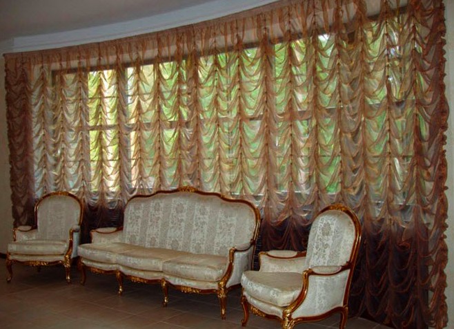 This type of curtain is of the cascade type. They have a special difference – they are assembled along the entire length to the floor itself. This option is ideal for large windows.