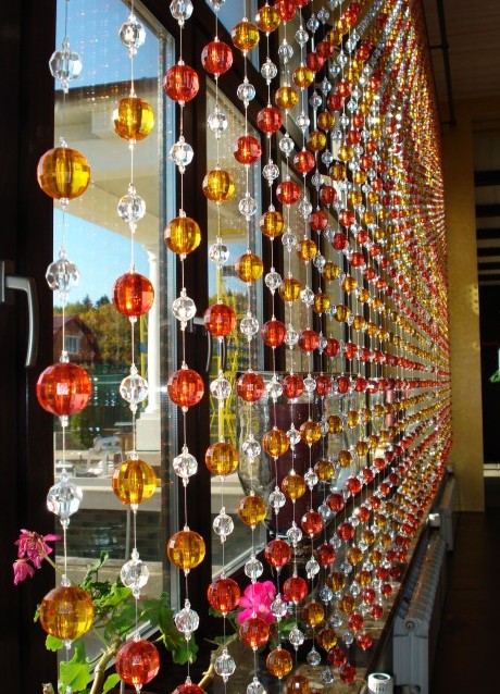 The material itself can also be easily replaced. This could be: beads, crystal beads, various small buttons and all kinds of details that can be easily threaded onto a thread or fishing line. Curtains made of glass beads look very original. They create the effect of flowing water.