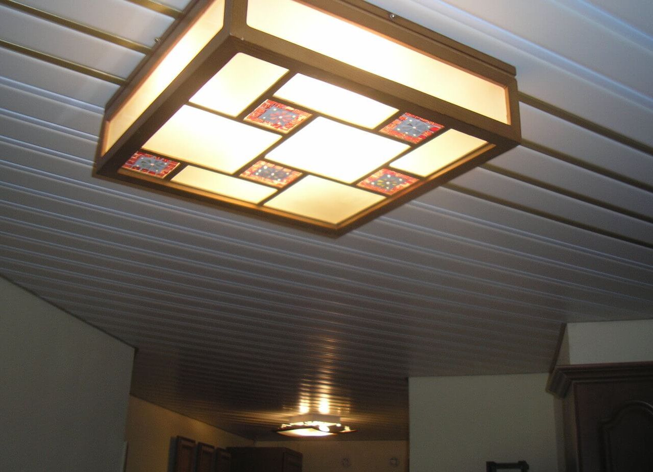 Suspended ceilings made of plastic panels, in addition to low cost, have a number of advantages: excellent moisture resistance and water resistance, which allows them to be used in the kitchen and bathroom. Also, PVC panels are easy to wash and clean; bacteria do not accumulate or multiply on them. Plastic is durable in use, does not crack, does not rot, and is an excellent sound-proofing and heat-insulating material. Plastic is not spoiled by any hygiene products or household chemicals, it is not subject to fading in the sun, and does not accumulate static electricity. Thanks to plastic, you can finish a ceiling that has unevenness, covering pipes, panels and wiring. A plastic ceiling makes it possible to experiment with lighting. Instead of the usual one, you can install spotlights, halogen lamps, and LEDs.
