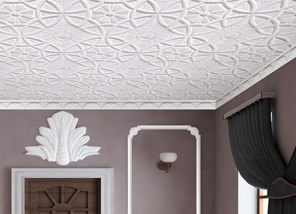 • ease of installation. Pasting ceilings with foam plastic tiles is carried out by applying glue (special, designed for working with foam plastic; universal or PVA) to the entire surface of the tile and then pressing it to the ceiling. The tiles can be mounted (glued) to any surface – from concrete and fiberboard to plaster and plaster;