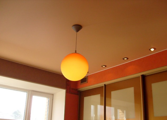 A satin ceiling, depending on the light, can take on different shades. In natural light, the fabric has its original shade; in bright artificial light, the shades become lighter; in dim light, the shades become darker. If the kitchen has several levels of lighting, then the ceiling, which was originally the same color, will appear multi-colored.