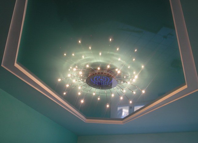 Often, against the background of such a ceiling, various patterns, and even entire paintings, are depicted. In the living room you can depict a blue sky with clouds or flowers, in the bedroom the starry sky is very popular, in the kitchen – asymmetrical designs of different discreet shades.