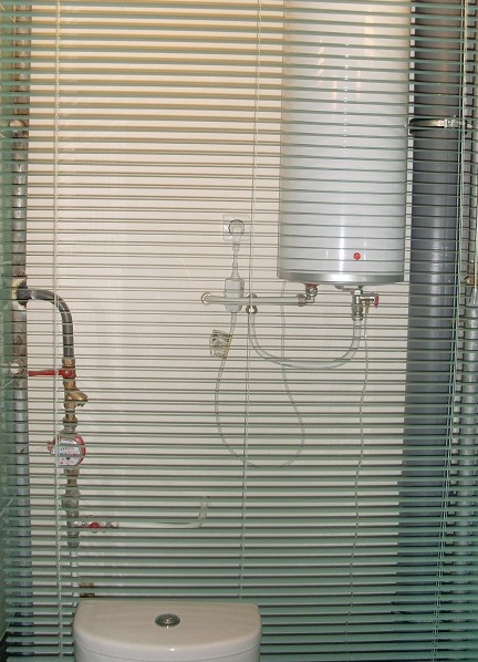Horizontal blinds attached to a closet in the toilet, made of plastic or aluminum, look great. Since the sizes of the toilet room in apartments are different, before buying blinds, you should take all the measurements from your closet, and only then go to the store to purchase.