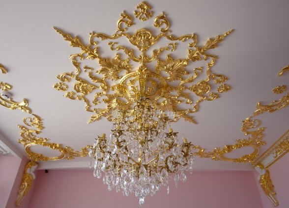 Often they decide to decorate the ceiling with rosettes to highlight a beautiful chandelier. In this case, they are attached in the center, as if framing the object of illumination. It should be noted that it is very important that the chandelier and the rosette match each other in style, otherwise there may be dissonance between them, which will affect the overall impression of the interior.