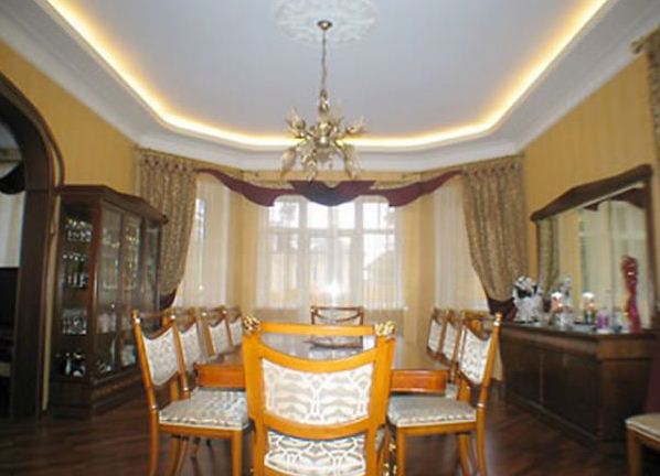 Typically, a ceiling cornice has the form of a flat rail, which is attached directly to the ceiling: regular, suspended or tensioned. A cornice for a stretch ceiling simultaneously performs two functions: both practical and aesthetic. Curtains or tulle are often hung on such cornices, and additional lighting can be installed on them. And, of course, a beautiful ceiling cornice for suspended ceilings serves as a decoration for any interior.