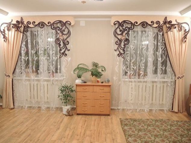 This is an openwork decoration made from curtain fabric. The decorative material is glued to a dense base, the so-called bandeau. Nobody creates unique ornate lines manually in production. Curly lambrequins in factories are made using precision equipment; here, such an innovation as laser cutting is used. It is extremely easy to remove this product, attach it to the cornice, and change places. Using ordinary Velcro, it can be installed by anyone, even a woman unfamiliar with technology.