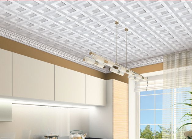 Ceiling tiles are made from expanded polystyrene, which is more commonly called polystyrene foam. This material is popular because of its low price and variety of patterns on the surface: imitation of marble, wood, iron and various colors.