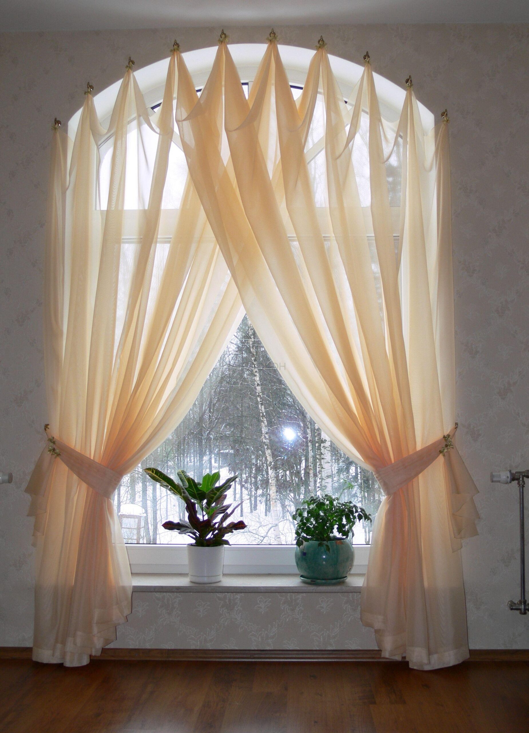 With the help of properly selected curtains and blinds, you can emphasize the unusual shape of the window. For arched windows, it is advisable to choose beautiful flowing curtains, decorated with a stylishly draped lambrequin. Mobile curtains that follow the curve of the arch are also relevant. It is better to avoid straight cornices and classic curtains, as they will hide the arched window opening, which, on the contrary, needs to be emphasized.