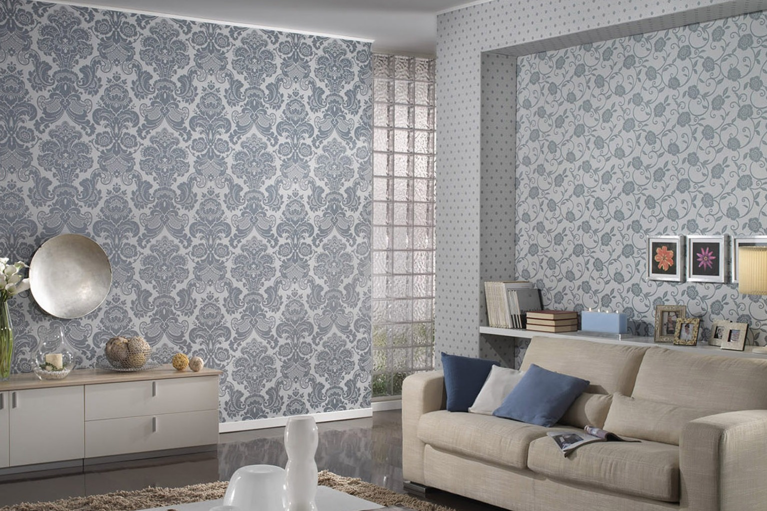 Combine different coverings with wallpaper. Velvet, holographic, and metallic designs combine perfectly with the calm tones of the main wallpaper.