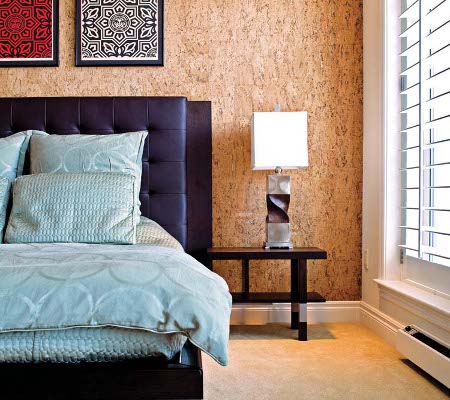 Cork has appeared on the building materials market for quite some time, but only in the last few years has it been actively used for finishing floors and walls. This material gained its popularity largely due to its environmental friendliness and spectacular appearance. Pasting cork onto walls is a creative process and designers manage to create entire panels and replace traditional wallpaper with them.